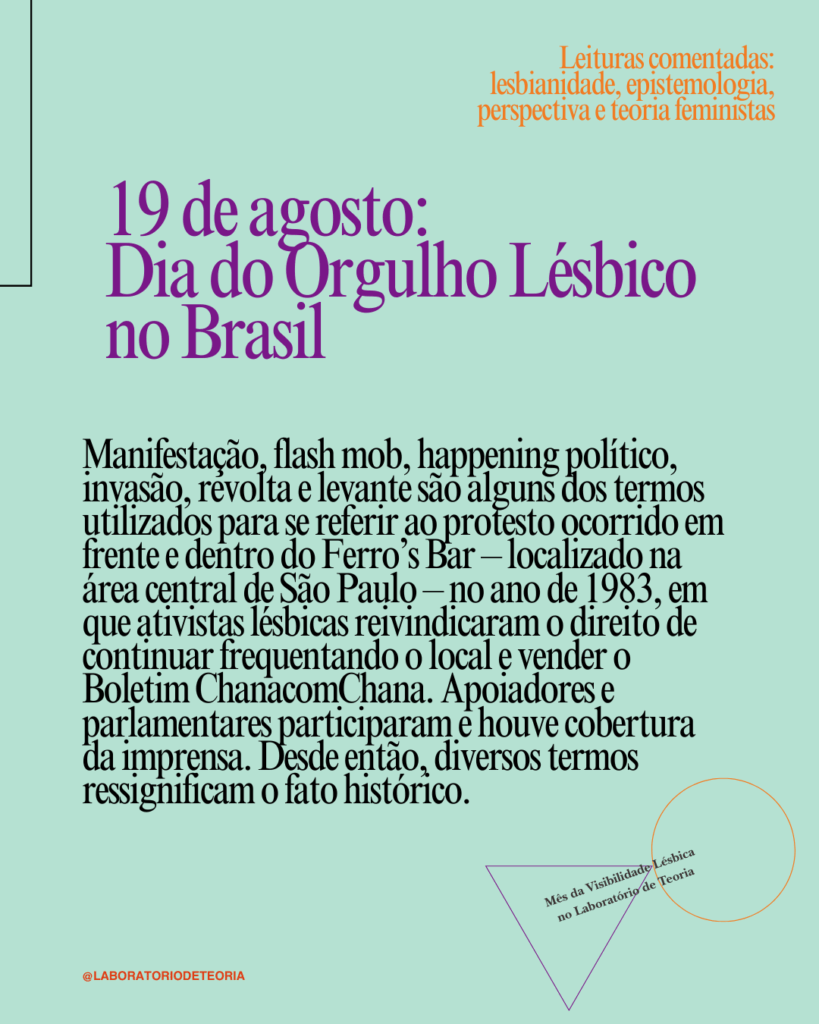 O dia 19 de agosto foi estabelecido em 2003 como o Dia do Orgulho Lésbico Brasileiro: uma homenagem ao 19 de agosto de 1983, data do protesto organizado por ativistas lésbicas no Ferro’s Bar, em São Paulo. São vinte anos entre o ocorrido e a homenagem.