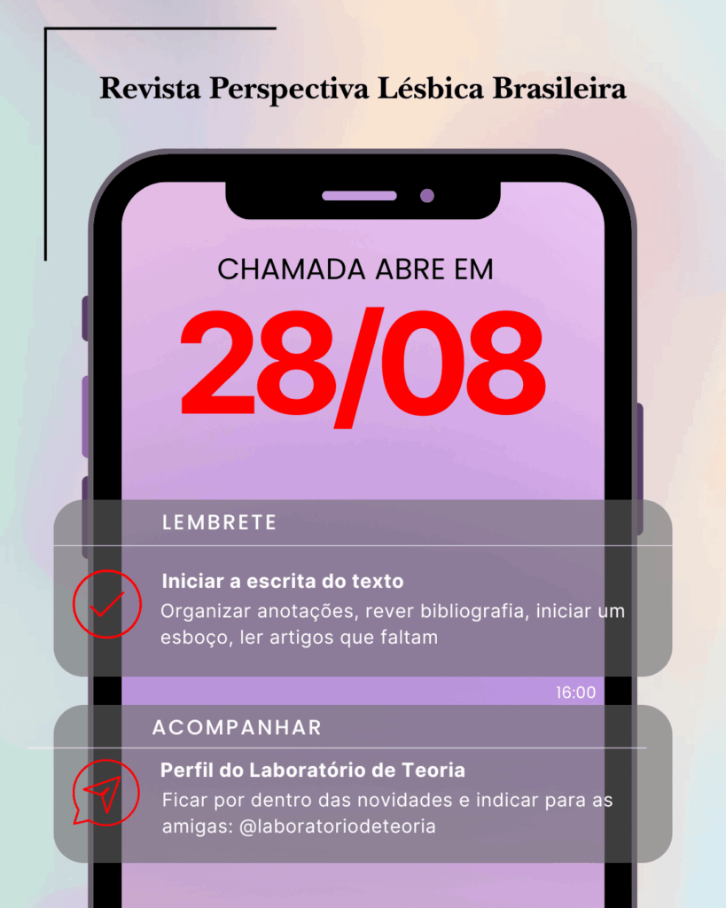 A Revista Perspectiva Lésbica Brasileira se propõe a abrir um espaço para as produções escritas de mulheres lésbicas. Prepare seu texto e faça parte da história e da cultura lésbica brasileira. Abrimos a chamada para submissões no dia 28/08, acompanhe!