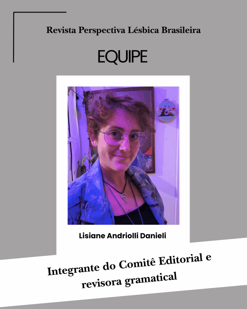 Lisiane Andriolli Danieli é professora e revisora de textos. Licenciada em Letras (Faculdade Porto-Alegrense – FAPA, 2013), especialista em Produção e revisão textual (Centro Universitário Ritter dos Reis – UniRitter, 2015), mestre em História da Literatura e doutora em Letras (Universidade Federal do Rio Grande do Sul – FURG, 2019 e 2023). Autora dos livros Quase todo e qualquer eu (2021) e Sereia sem ideias (2021) e de vários artigos, como “Do céu ao inferno: a formação lésbica em O Poço d